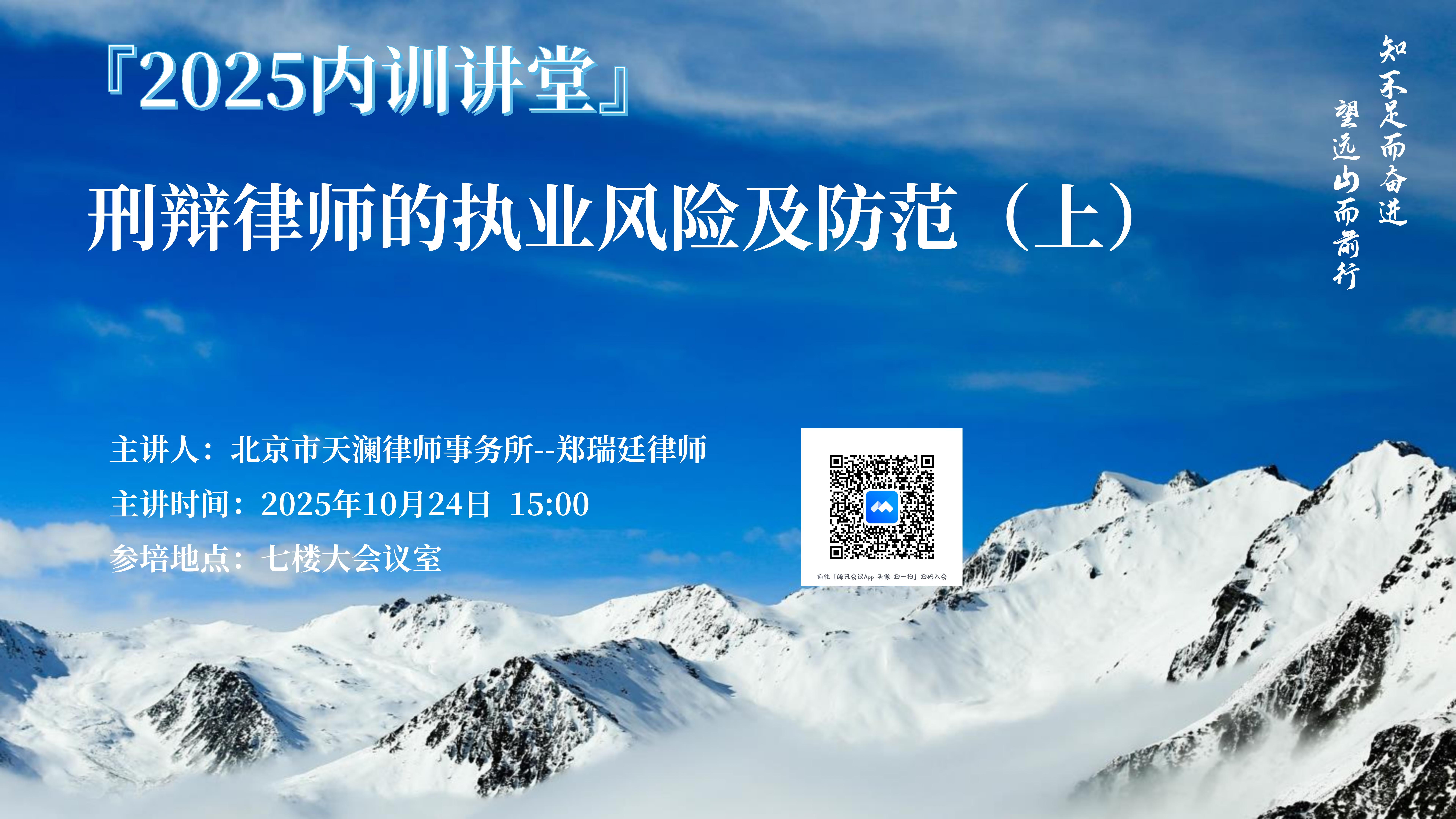 2025年10月24日下午,北京天澜所业务主管郑瑞廷律师带来一场名为《刑辩律师的执业风险及防范》的主题分享,该主题分为上下两部分,分两次进行。总分所全体员工通过线上、线下方式共同参与了本次培训。