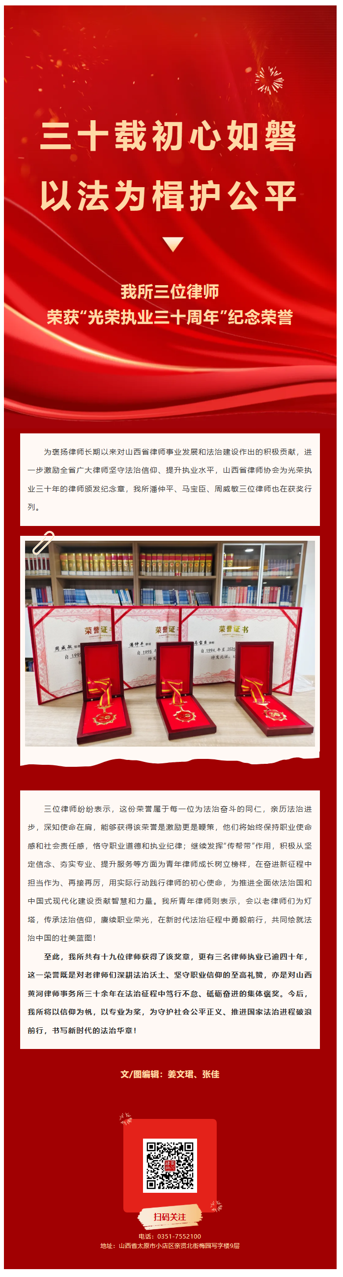 三十载初心如磐 以法为楫护公平——我所三位律师荣获“光荣执业三十周年”纪念荣誉