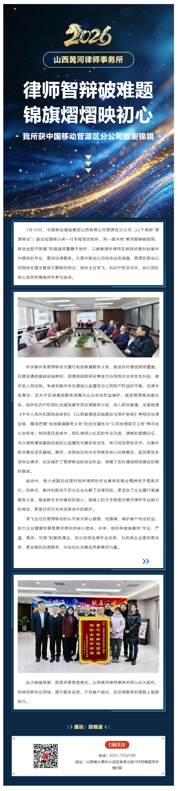 新闻动态丨律师智辩破难题 锦旗熠熠映初心——我所获中国移动晋源区分公司致谢锦旗