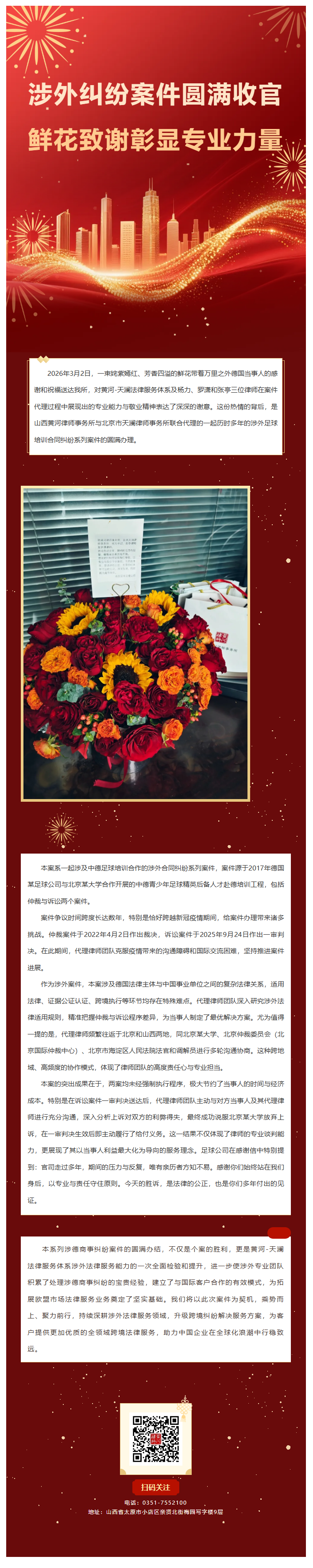 荣誉激励丨涉外纠纷案件圆满收官 鲜花致谢彰显专业力量